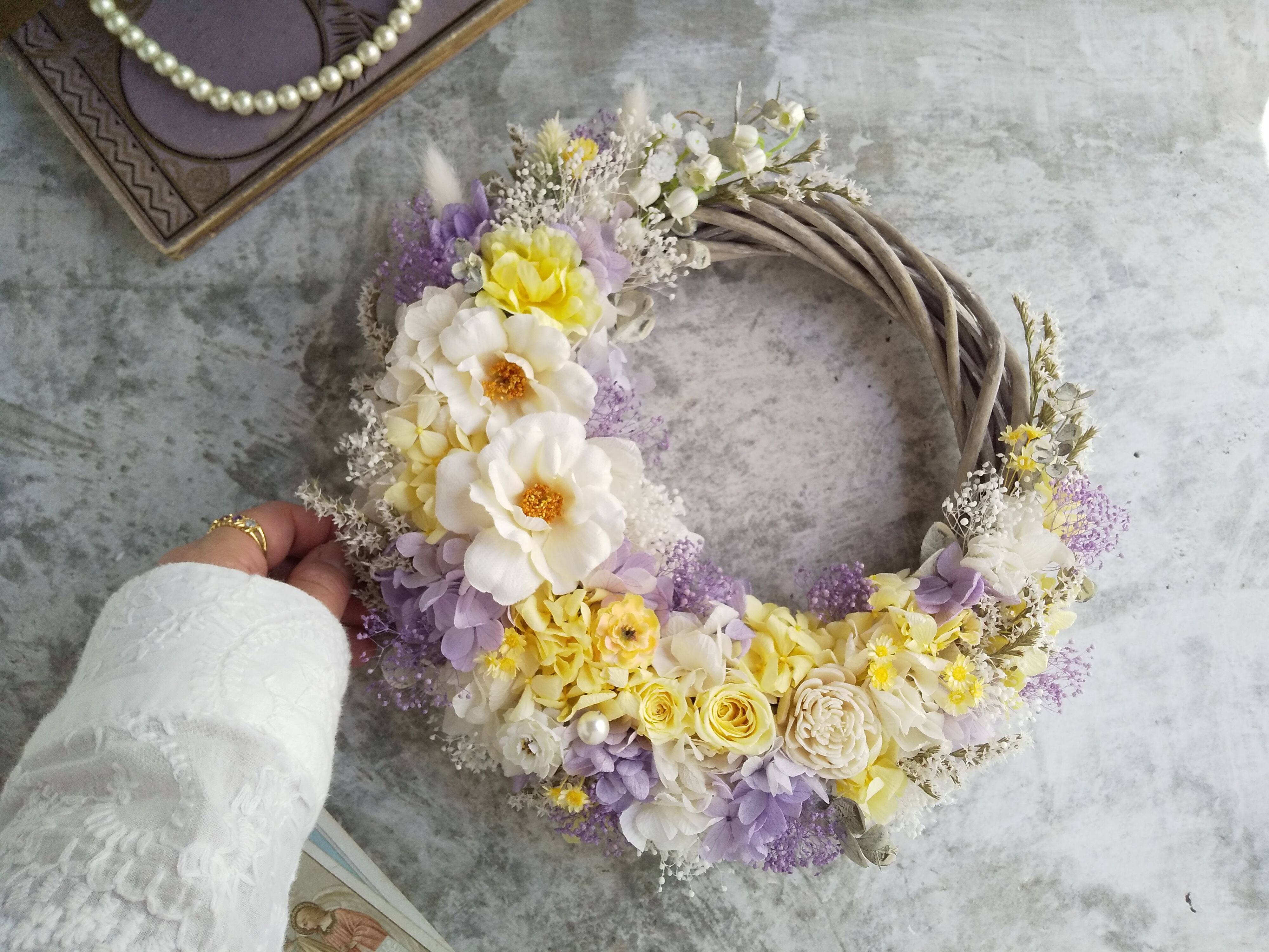 Jolie botanique<raffiné>*春リース*スプリングリース*ハーフリース*三日月リース母の日*プリザーブドフラワー*結婚祝い*北欧*春*玄関リース*母の日*母の日ギフト