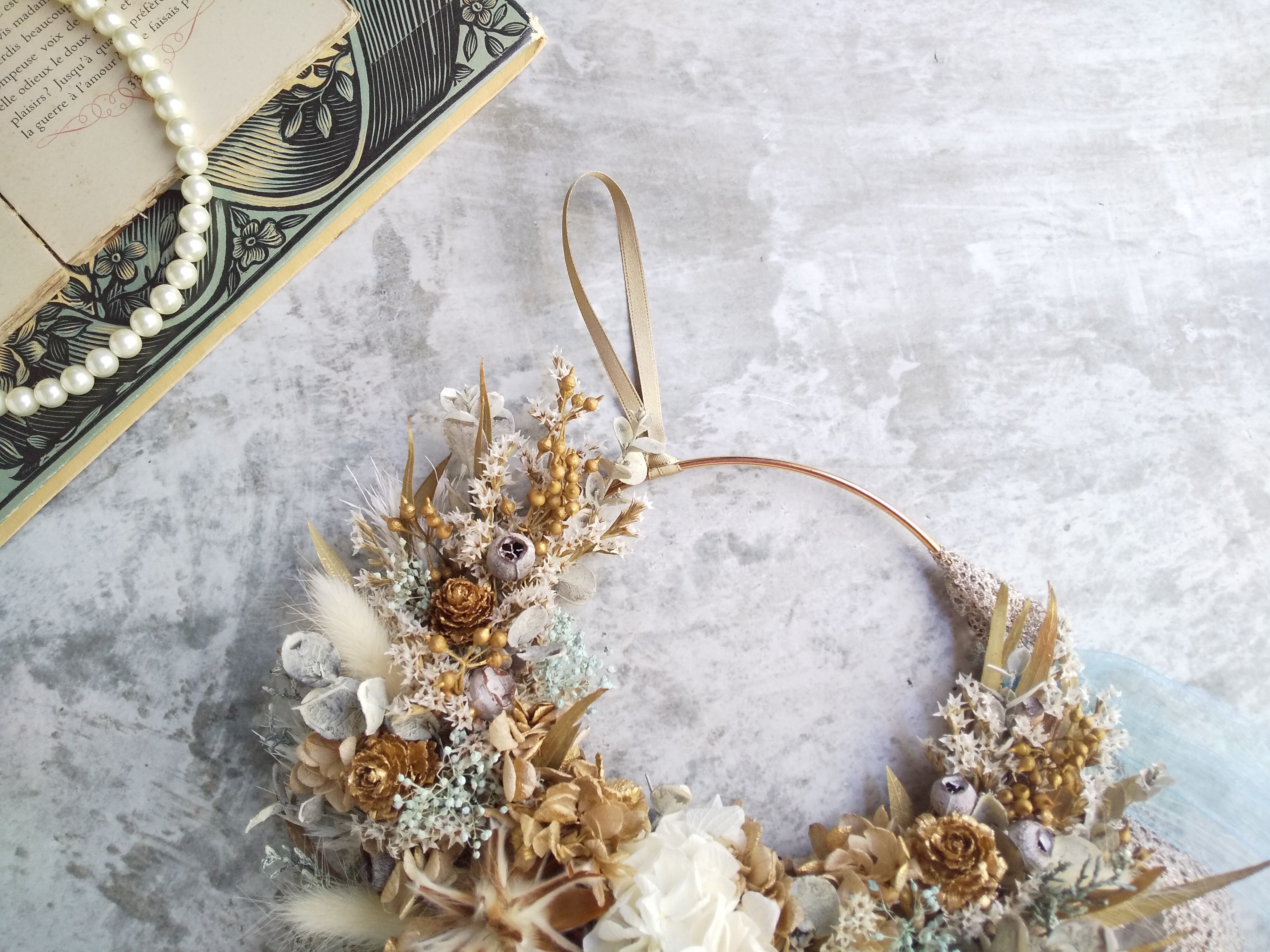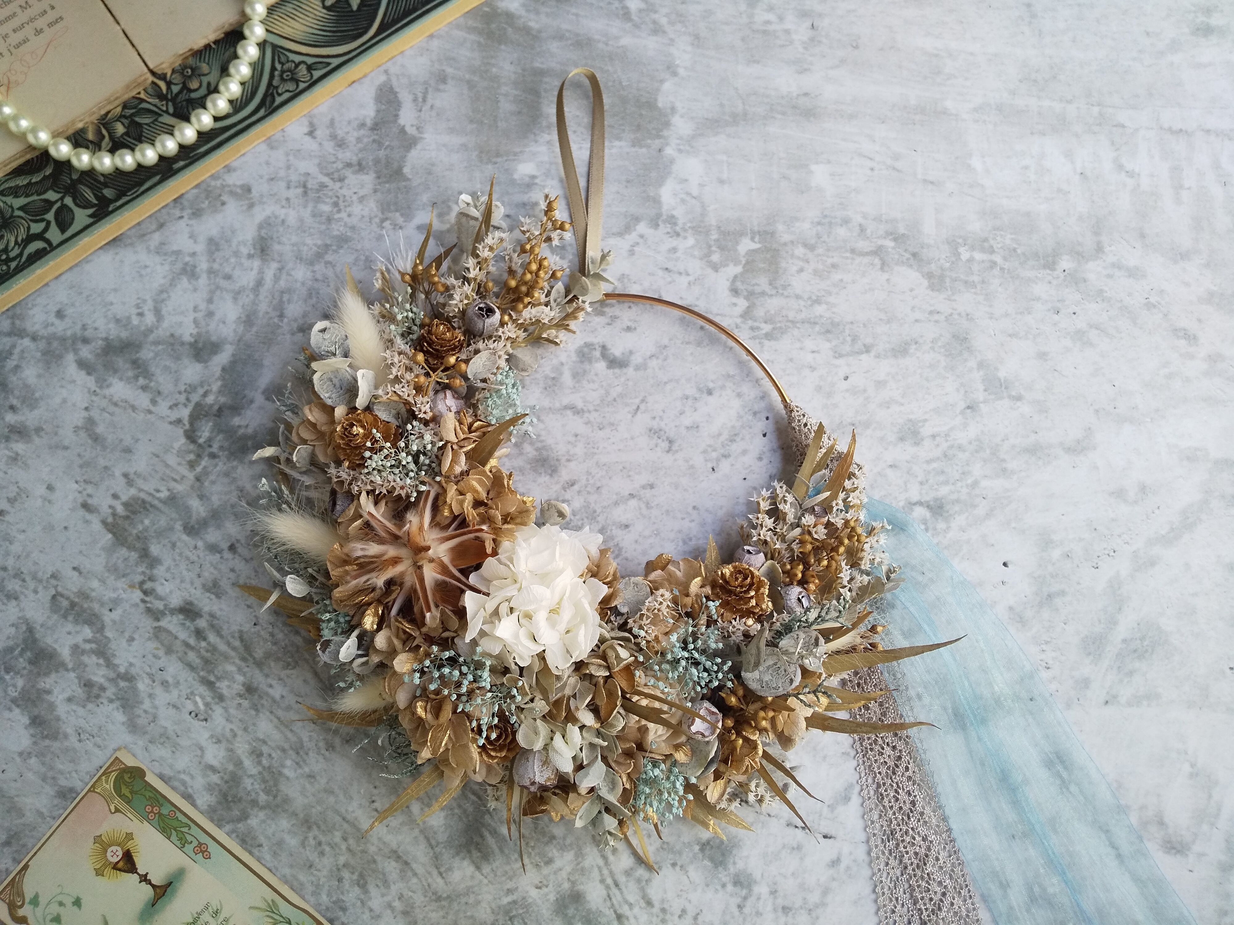 また、リースのお花の重さによってワイヤーリングの素材上すべりやすく 掛ける位置がお好みの場所で固定しづらい場合がございますので、ゴールドのサテンリボンもお付けしています。(画像をご参照くださいませ)