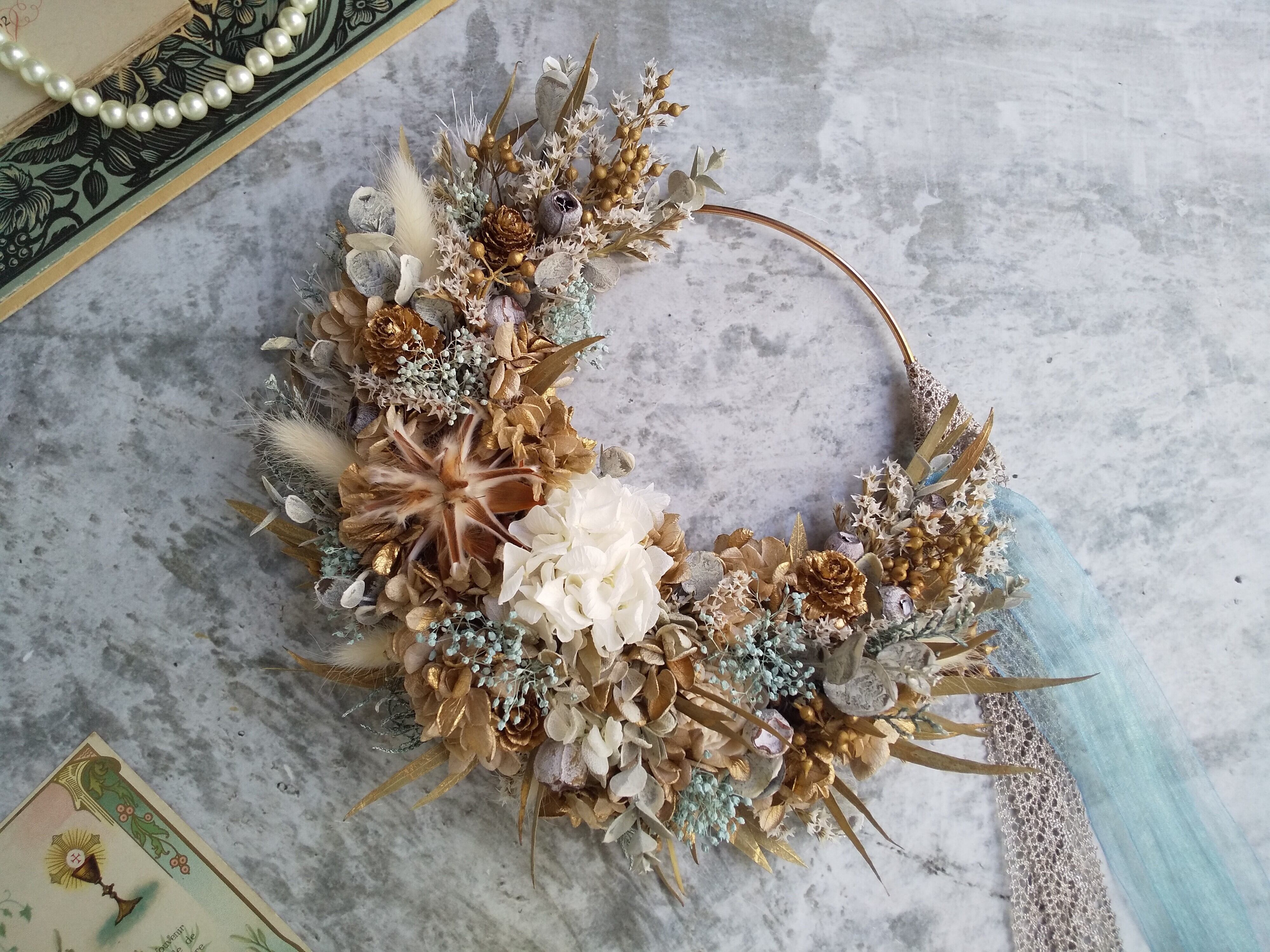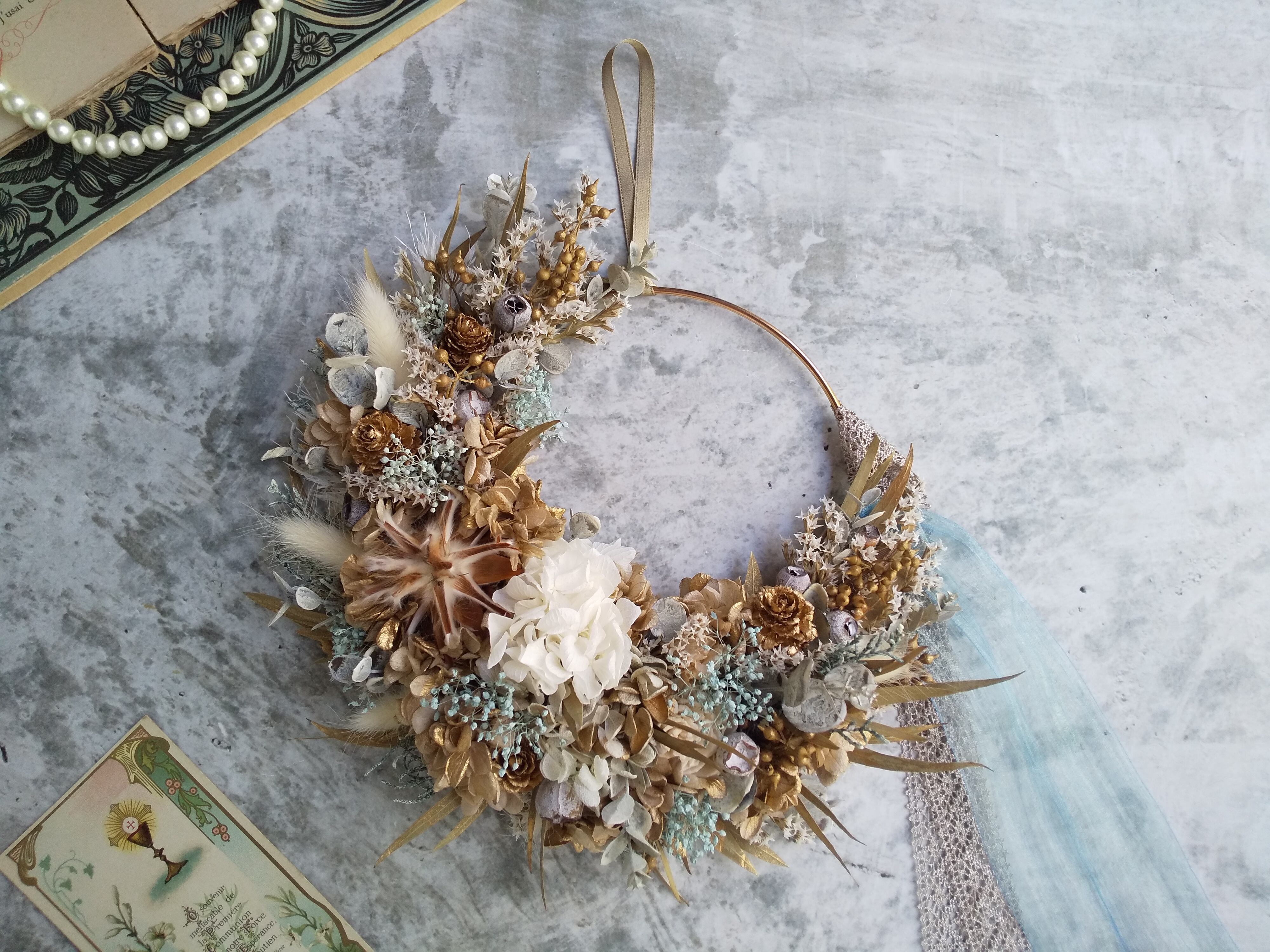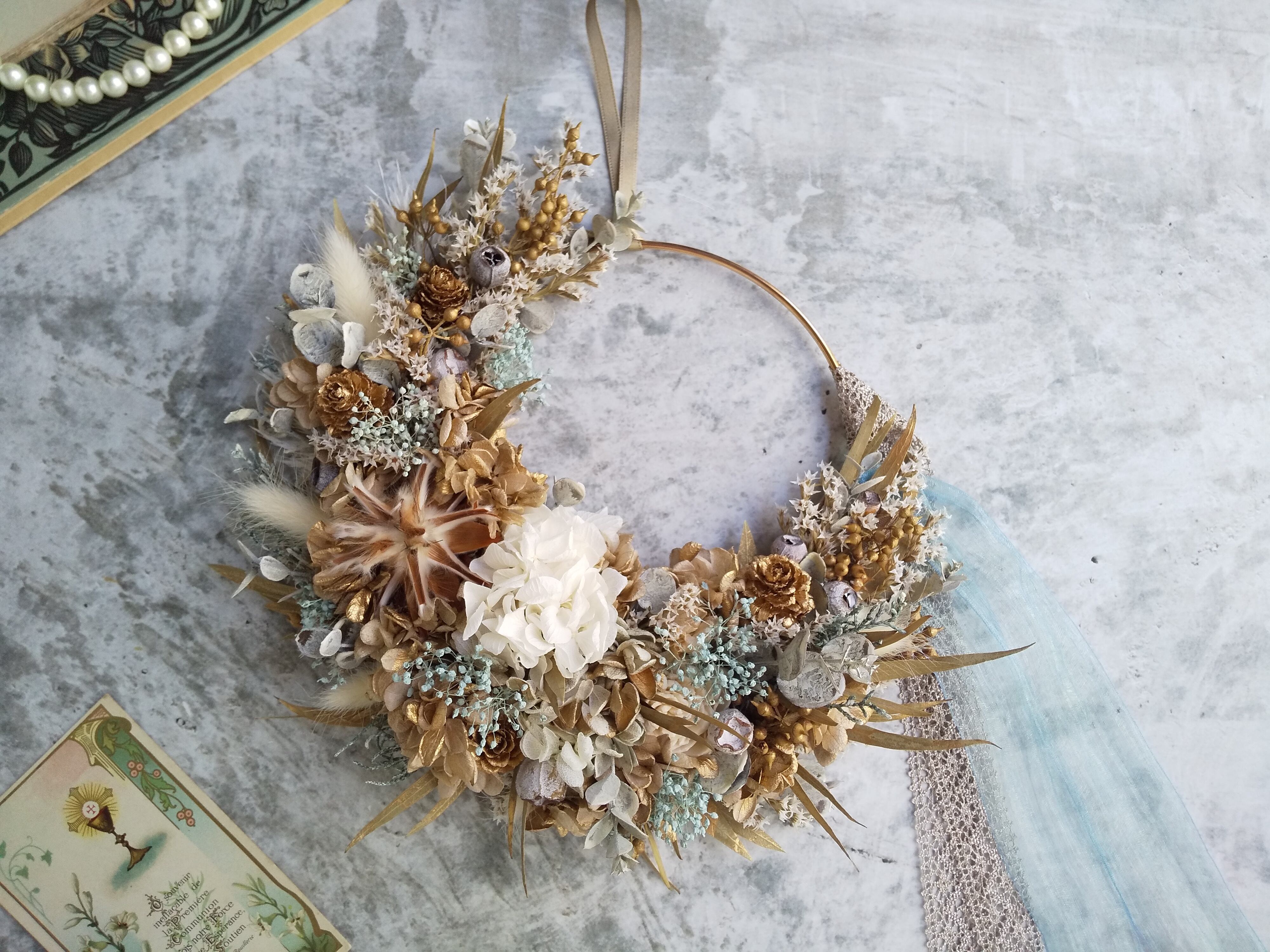 ⁿᵉʷ⚘.。Lune Bonheur<doré champagne>*リース*ハーフリース*紫陽花*フラワーリース*初夏リース*春夏秋冬*ゴールド*結婚祝い*ホワイトリース*白*結婚祝いハーフリース