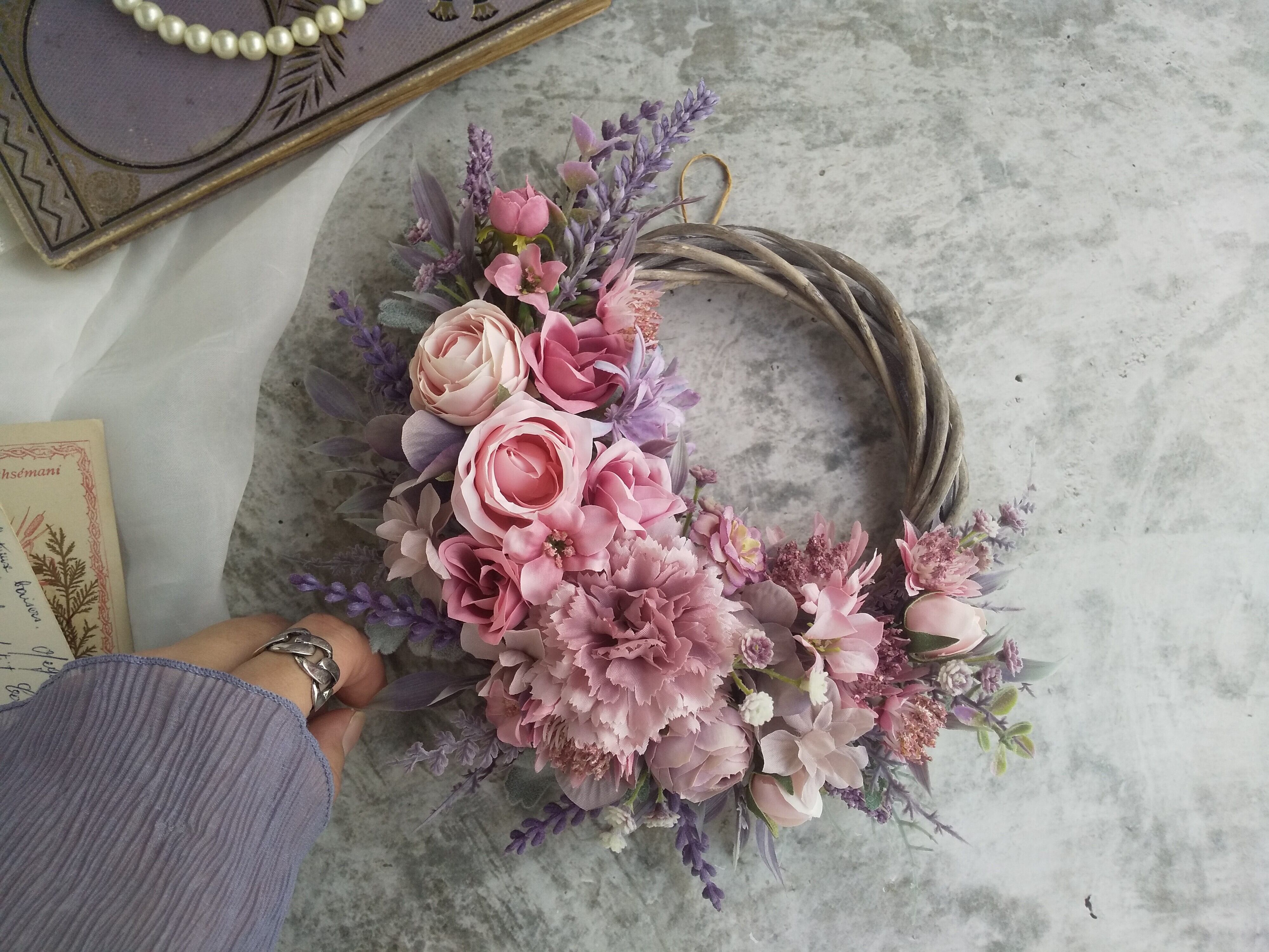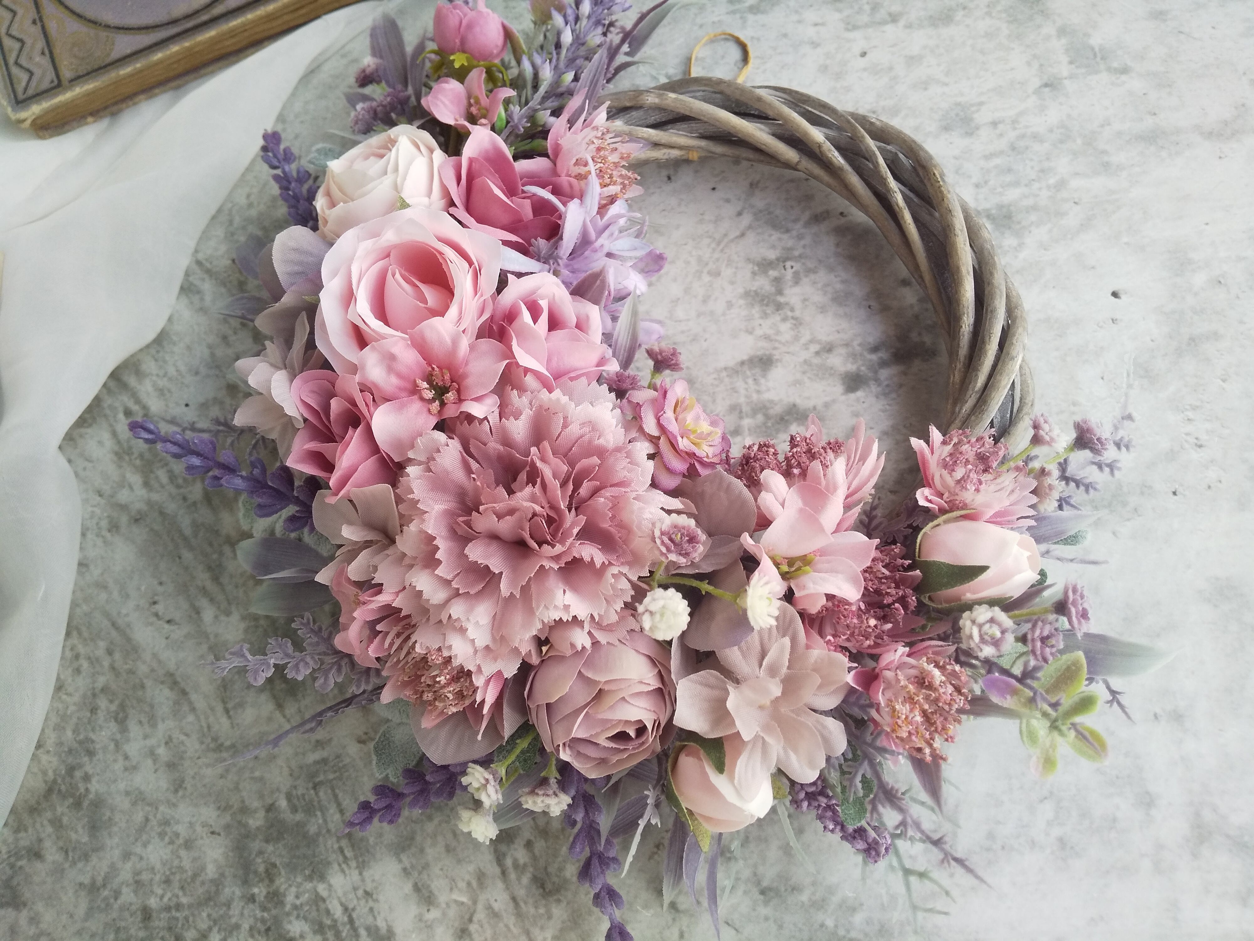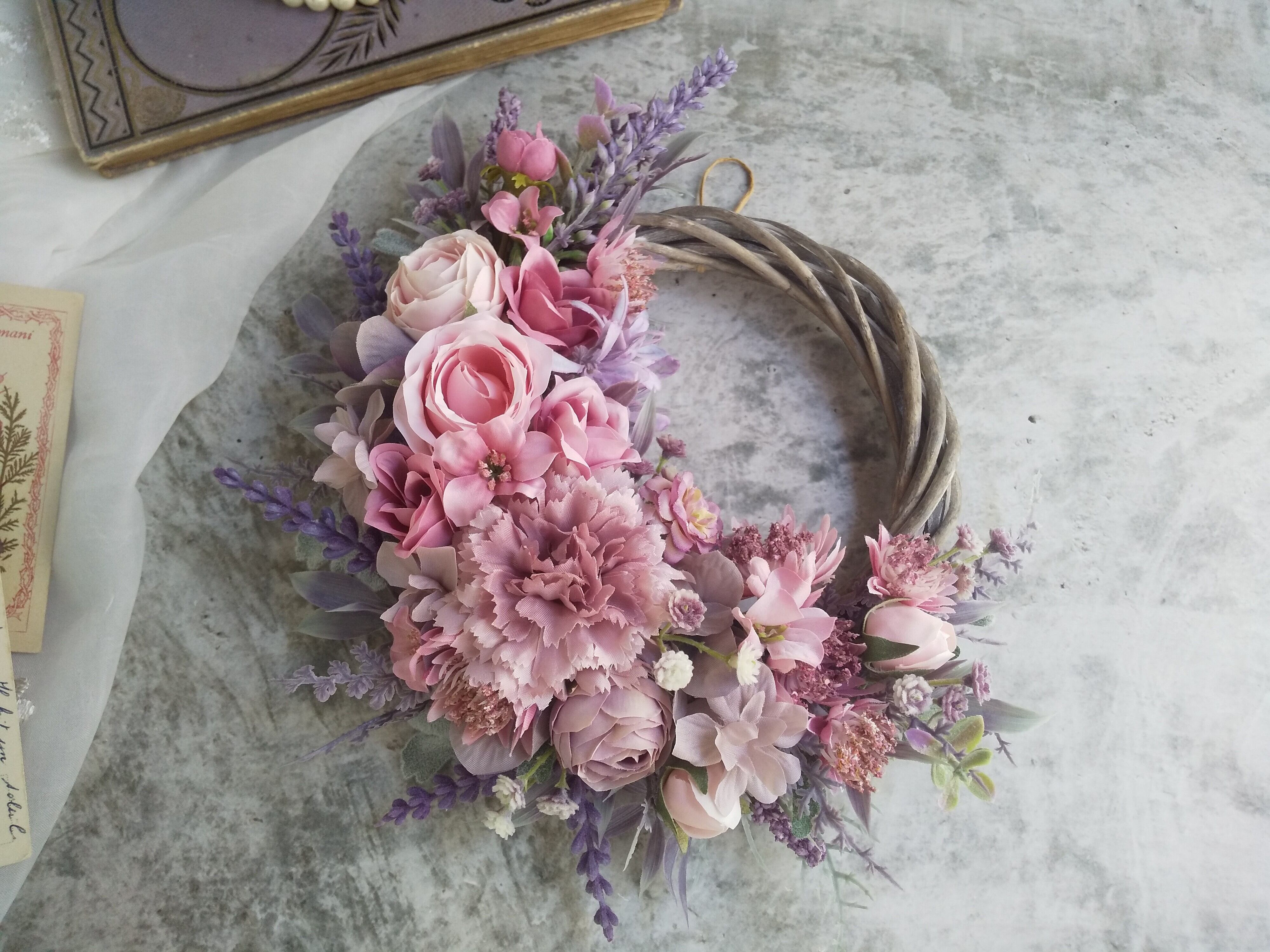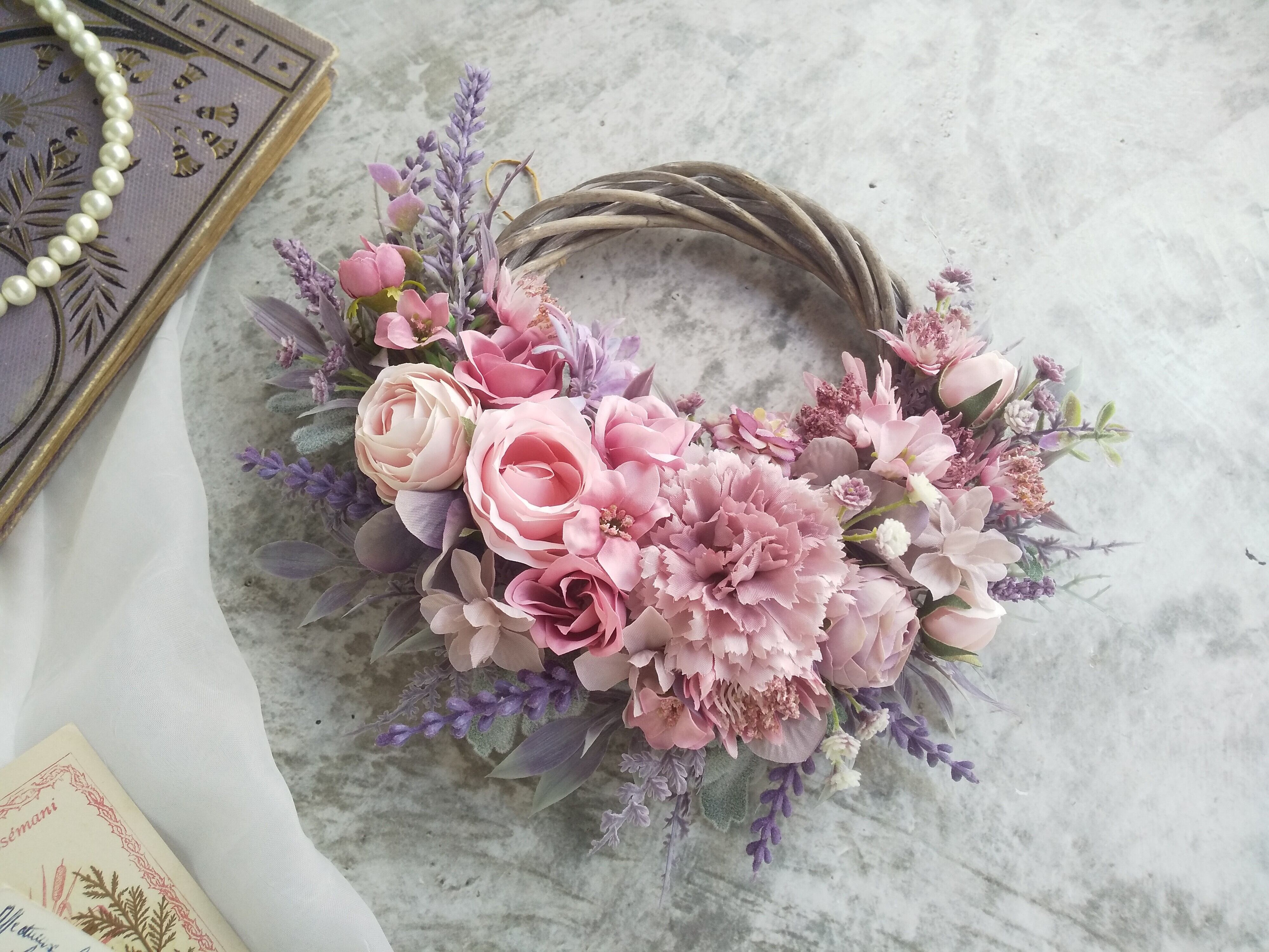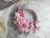 花材:<アーティフィシャルフラワー>ローズ・カーネーション・アジサイ・ラベンダー・ユーカリ・アストランティア・ポンポンローズ・小花・実もの・葉ものなど
