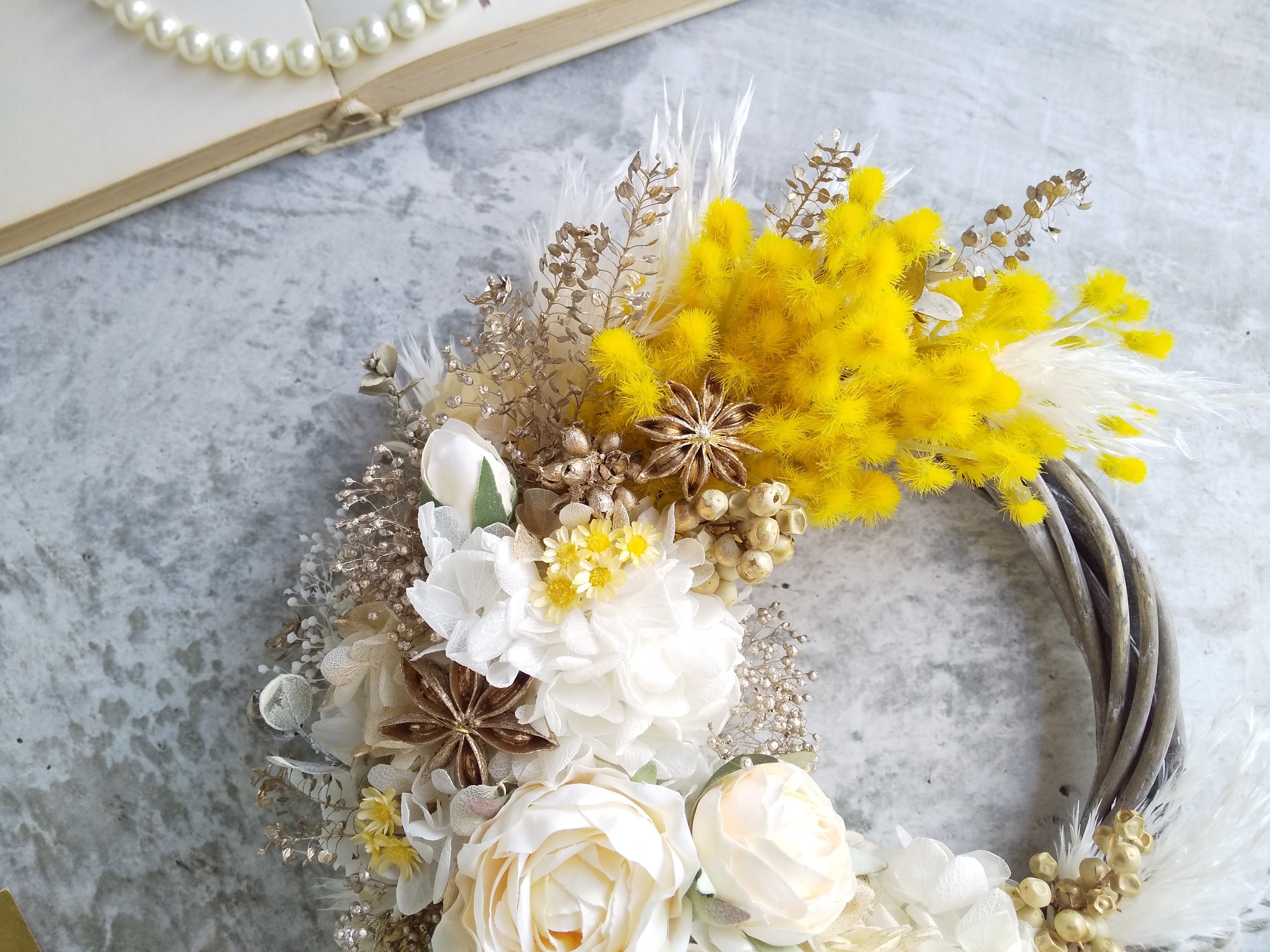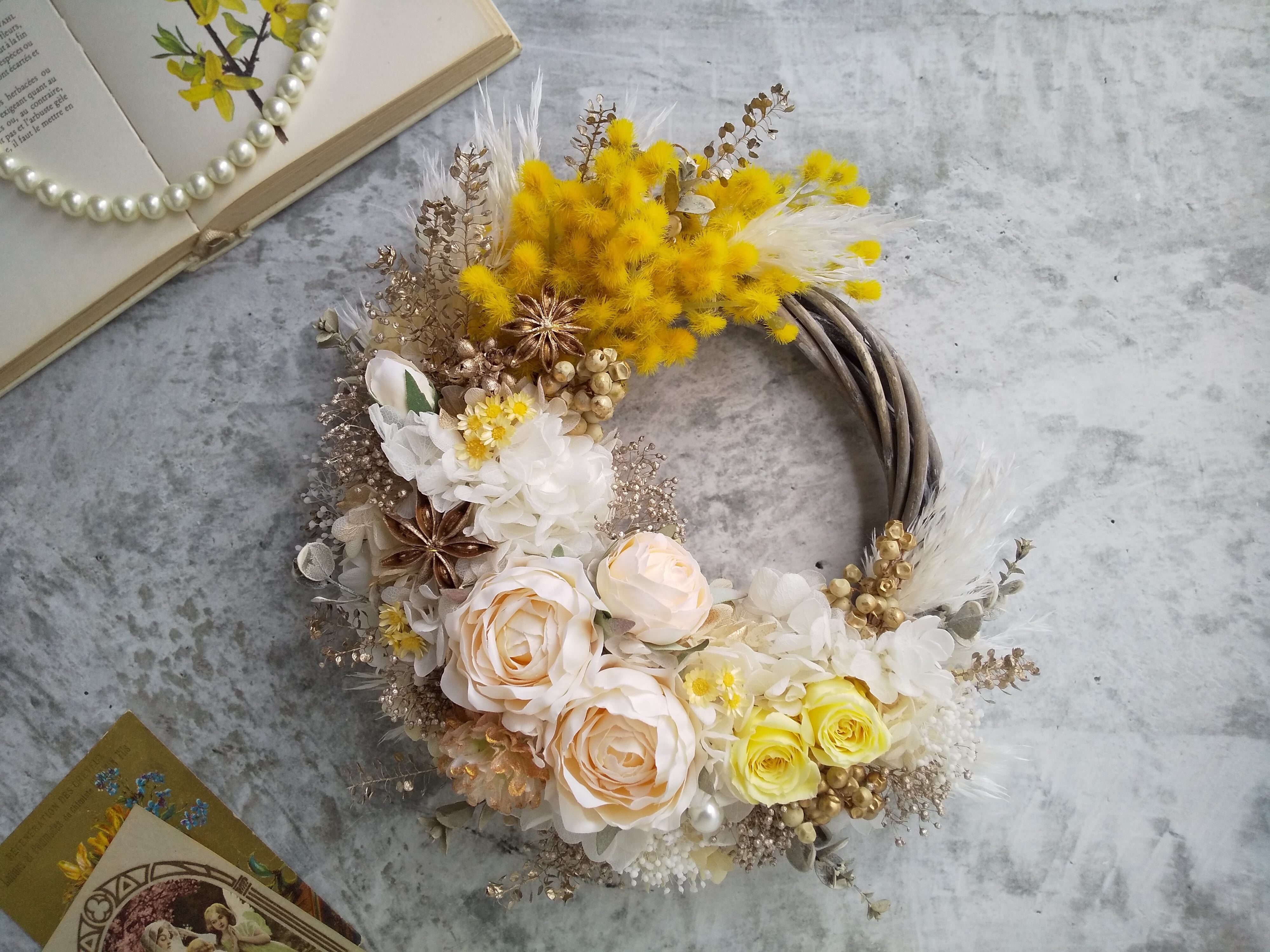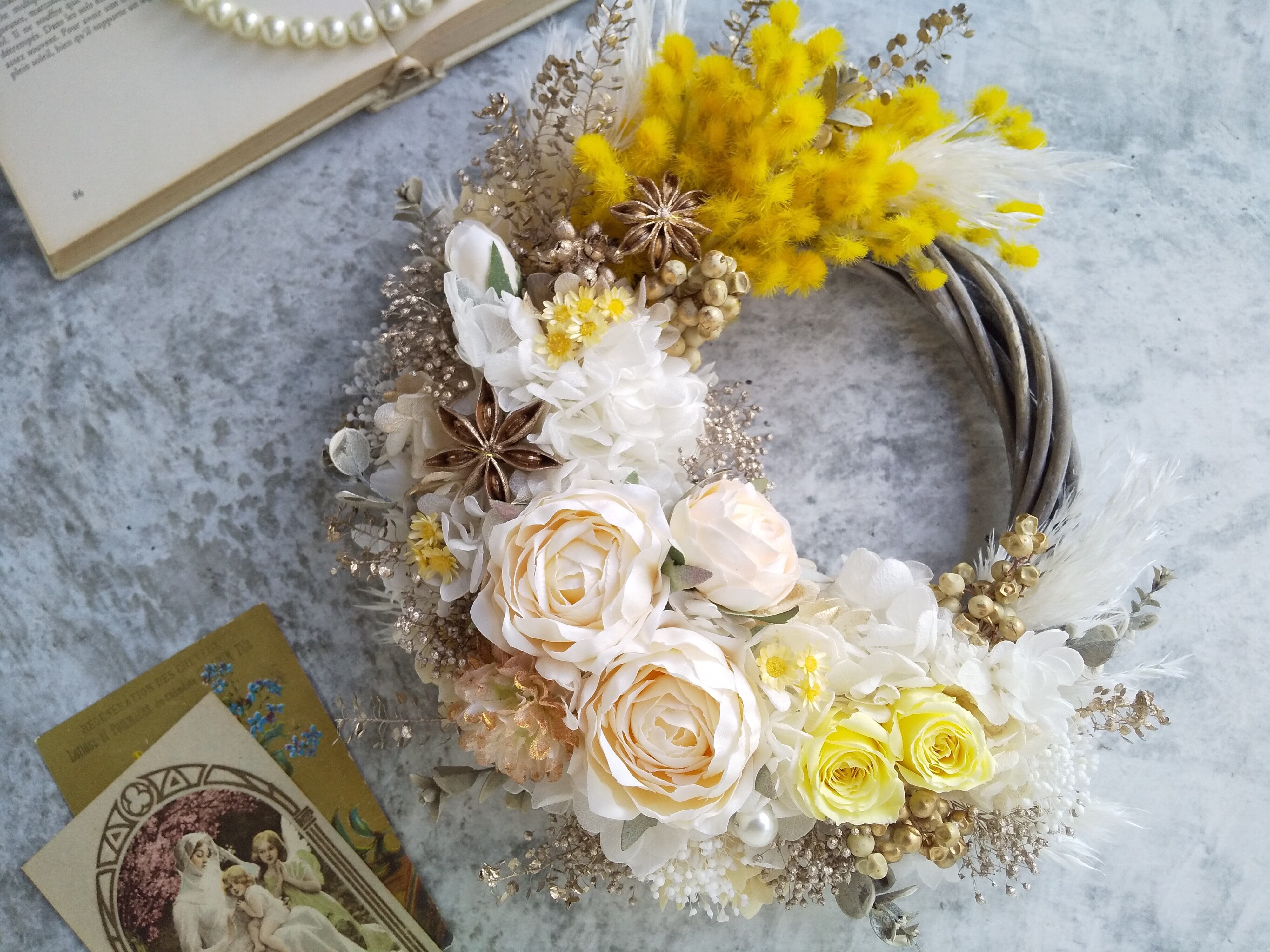 ぽんぽんミモザとミルフィーユローズのアンティーク感溢れるリース