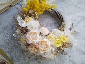 心地の良い明るい花色たちで、幸せ運ぶリースとなりますよう願いを込めて…