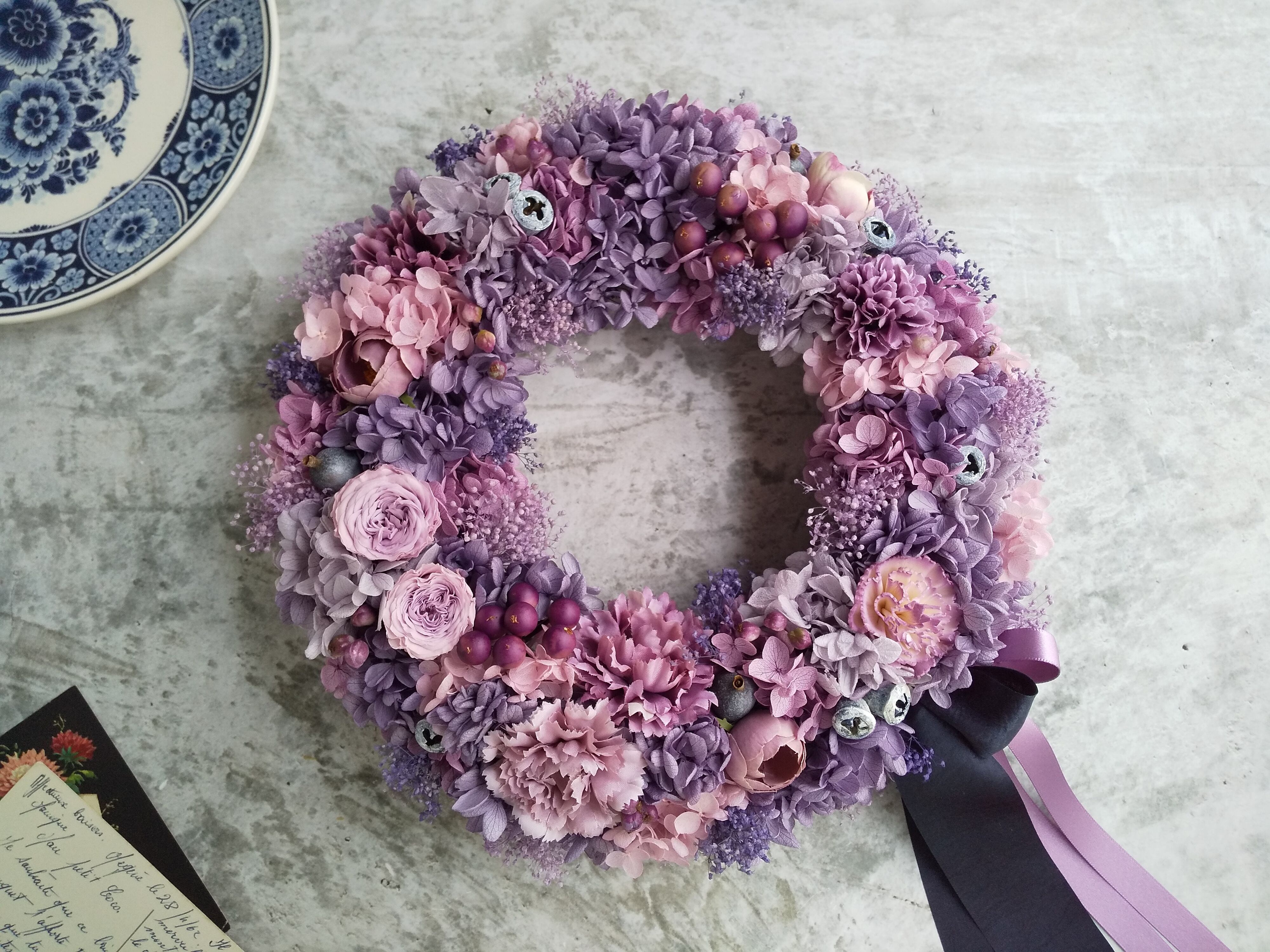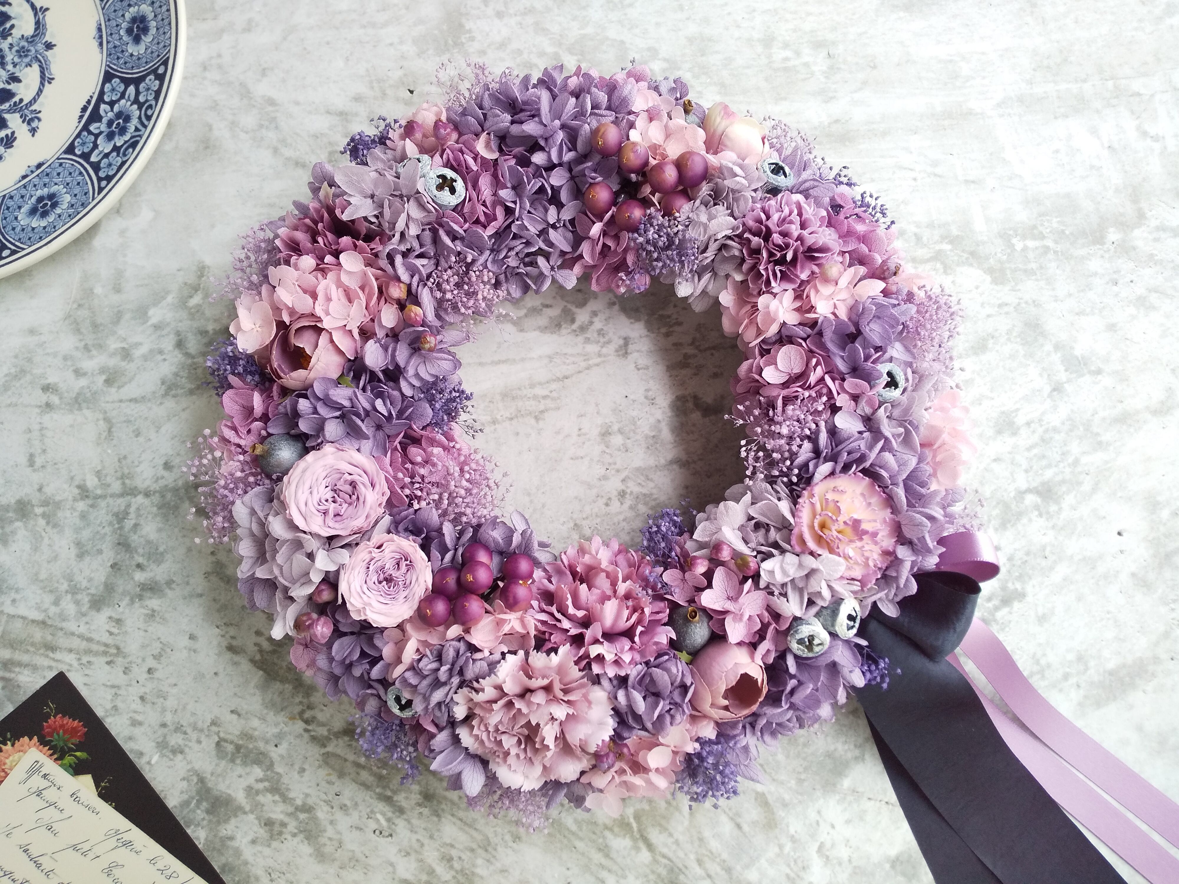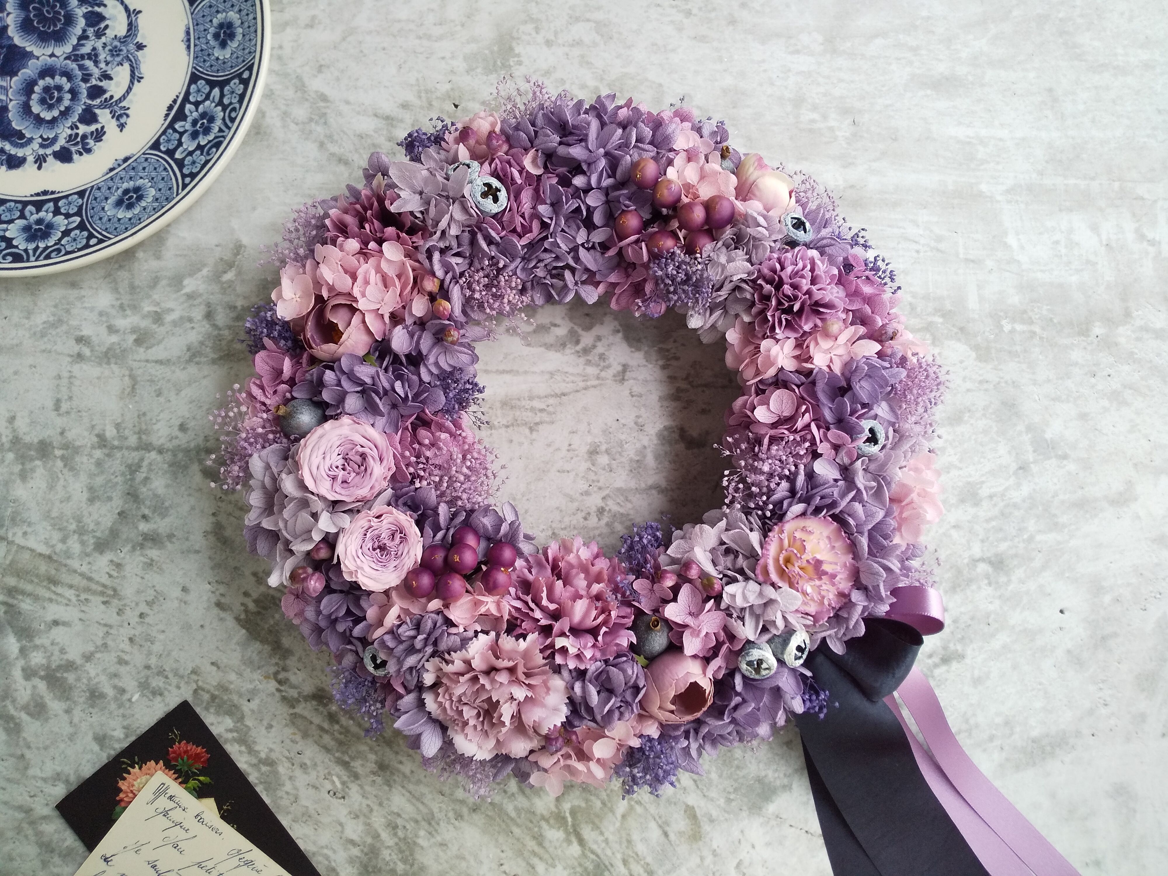 Pleine lune<Plein de bonheur>*母の日*母の日リース*古希祝い*リース*春夏*紫*紫陽花*プリザーブドフラワー*紫陽花リース*お花*結婚祝い*シャビーシック