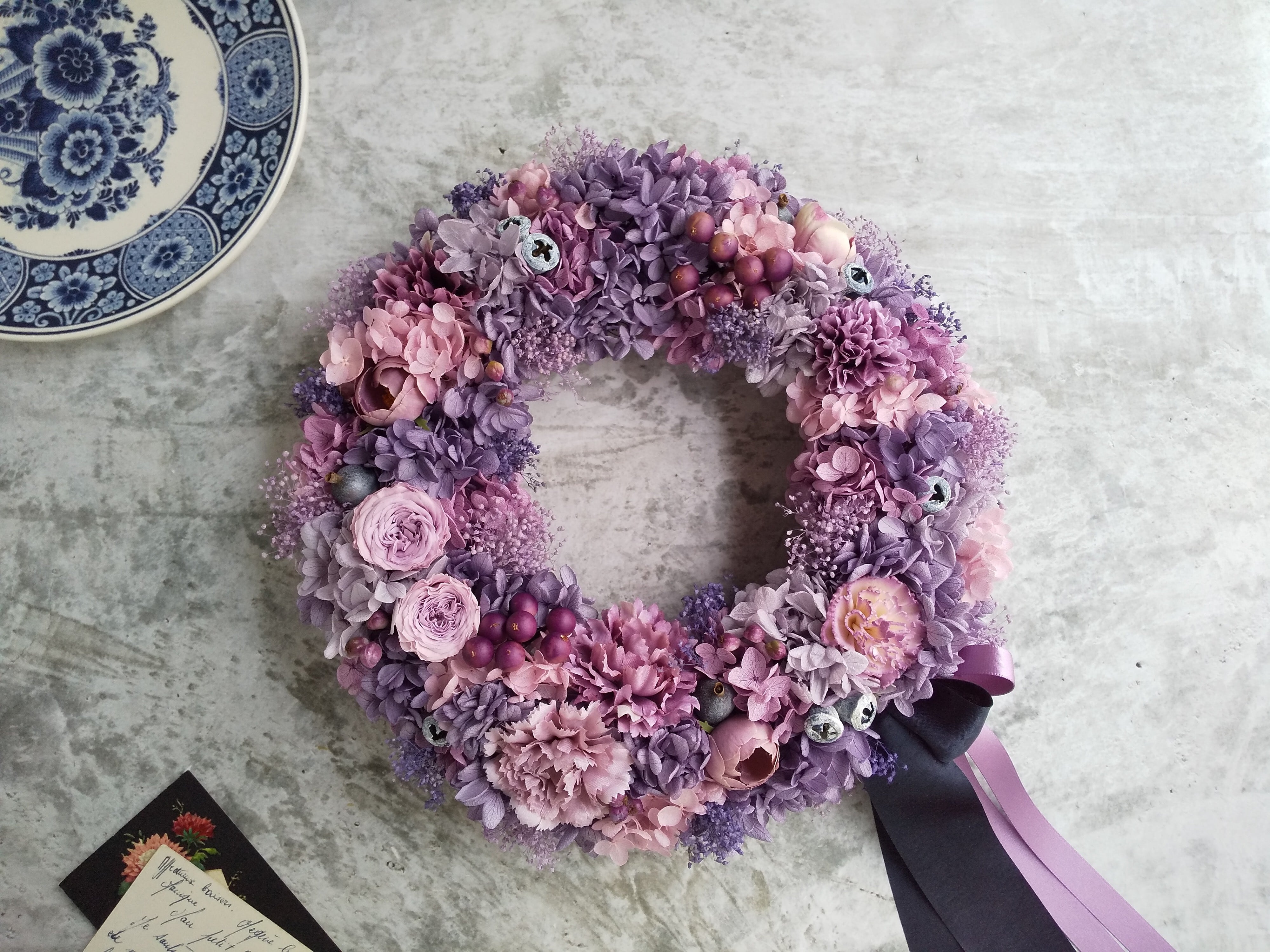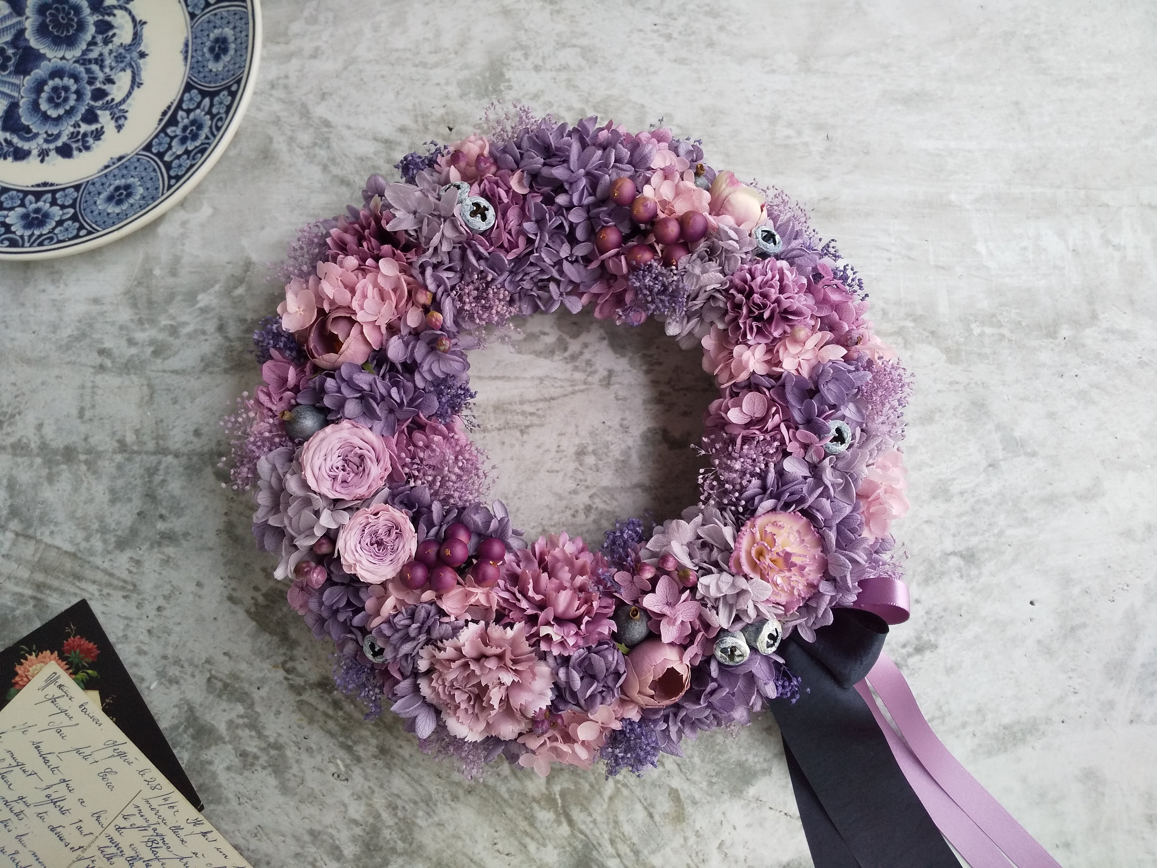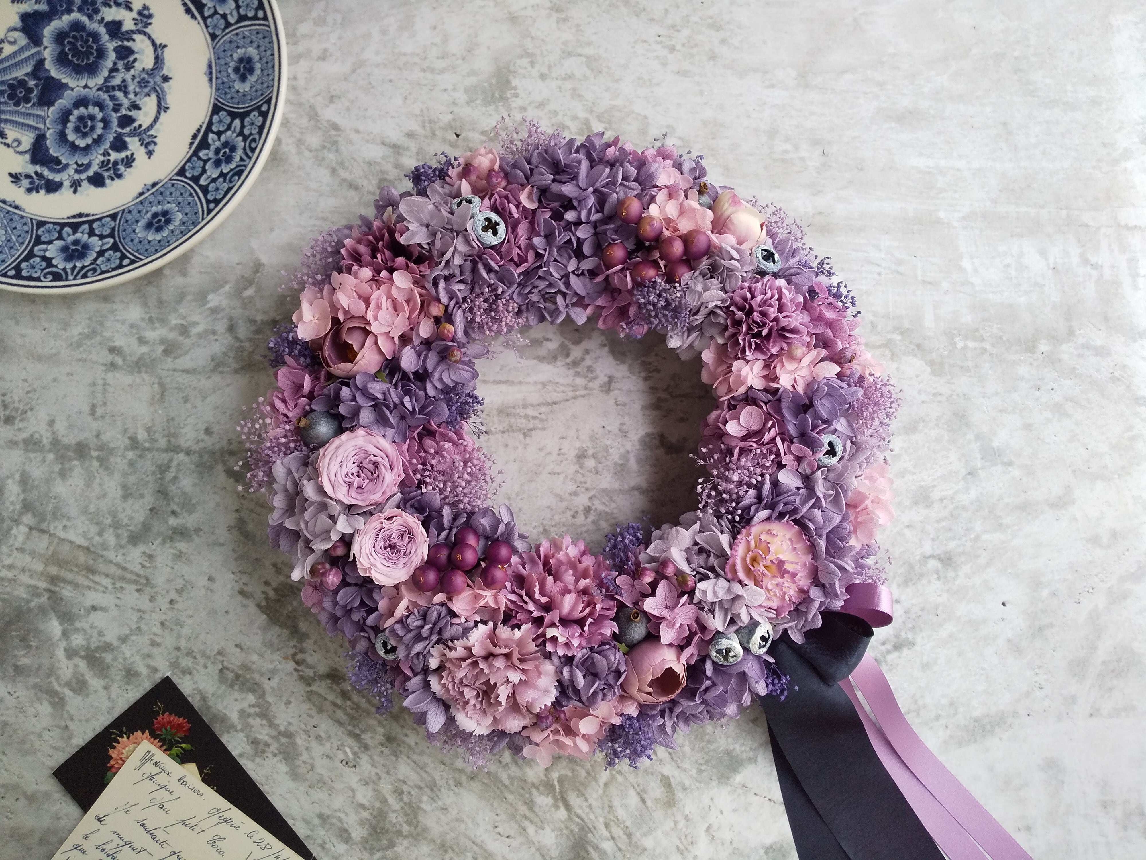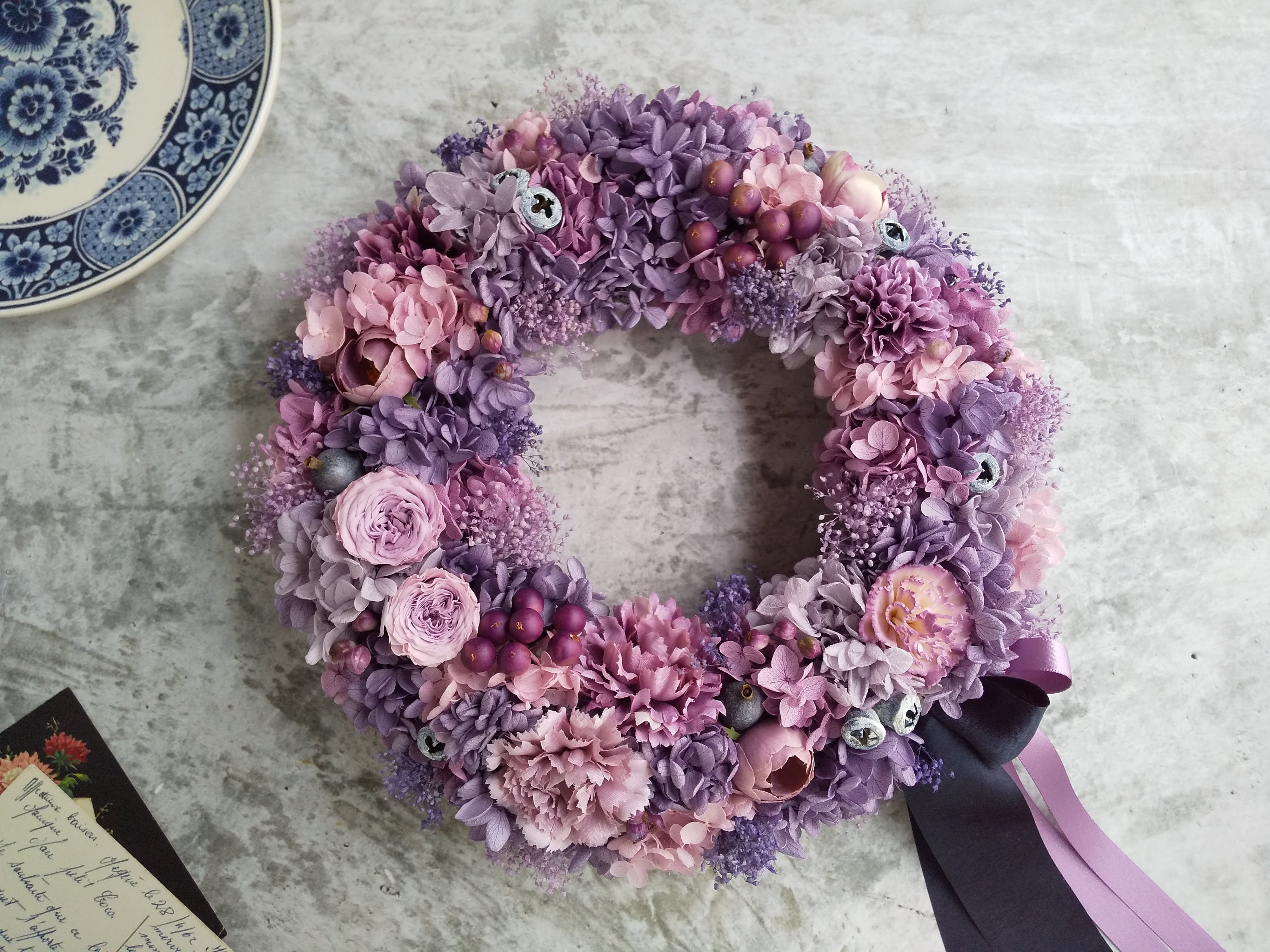 Pleine lune<Plein de bonheur>*母の日*母の日リース*古希祝い*リース*春夏*紫*紫陽花*プリザーブドフラワー*紫陽花リース*お花*結婚祝い*シャビーシック
