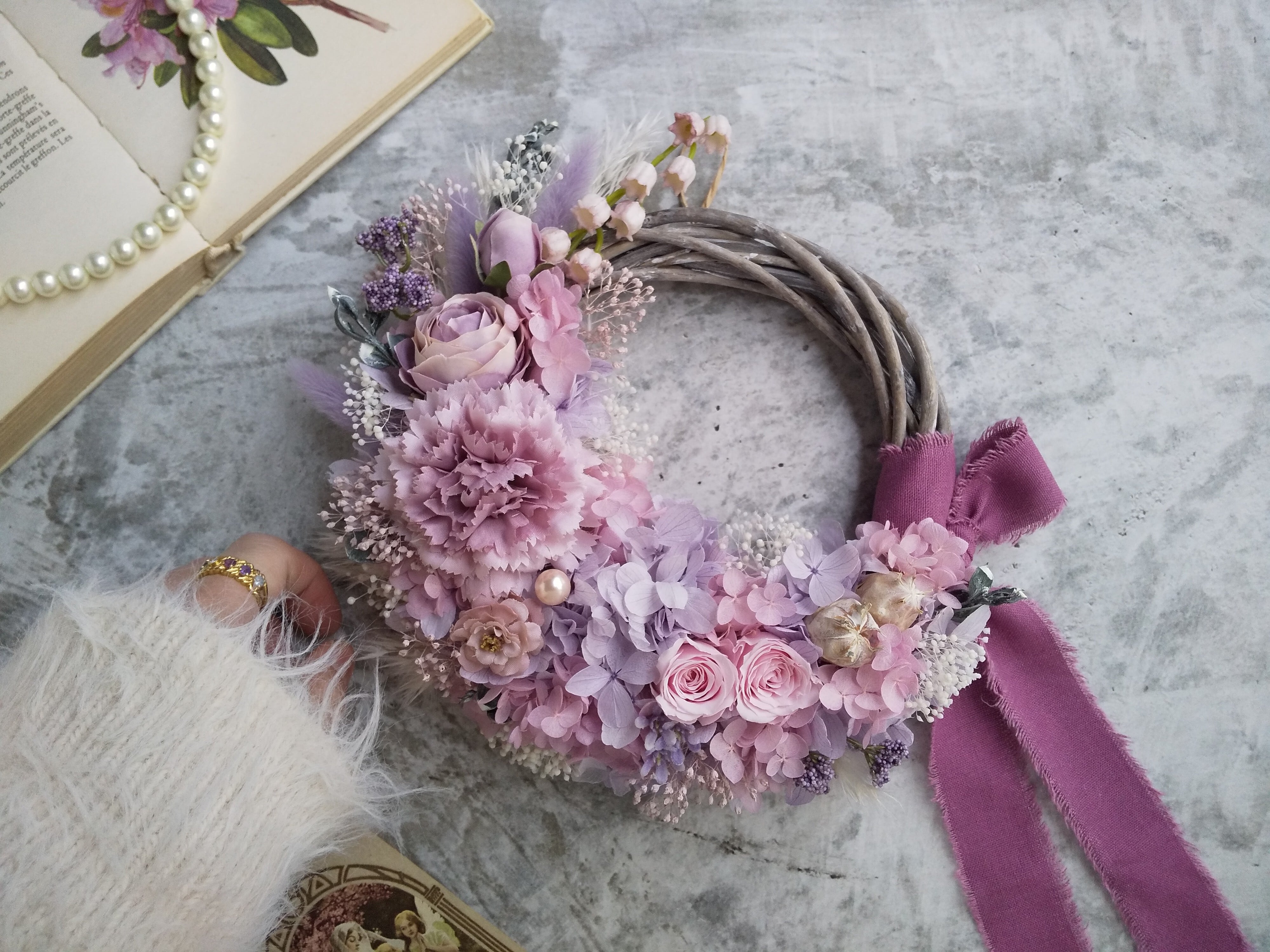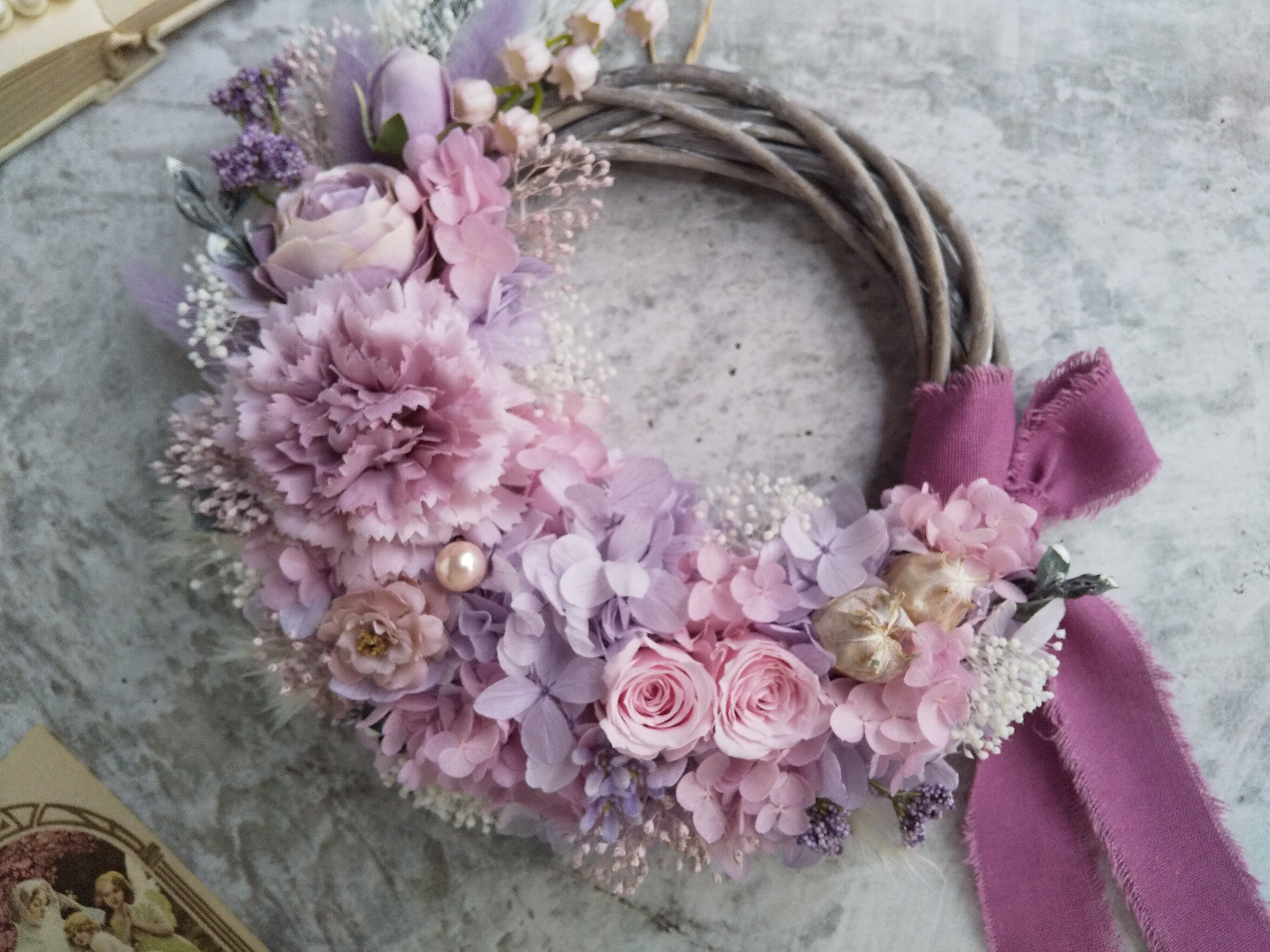 アンティークパープル×シャーベットピンクのふんわり優しい色彩のお花たち。