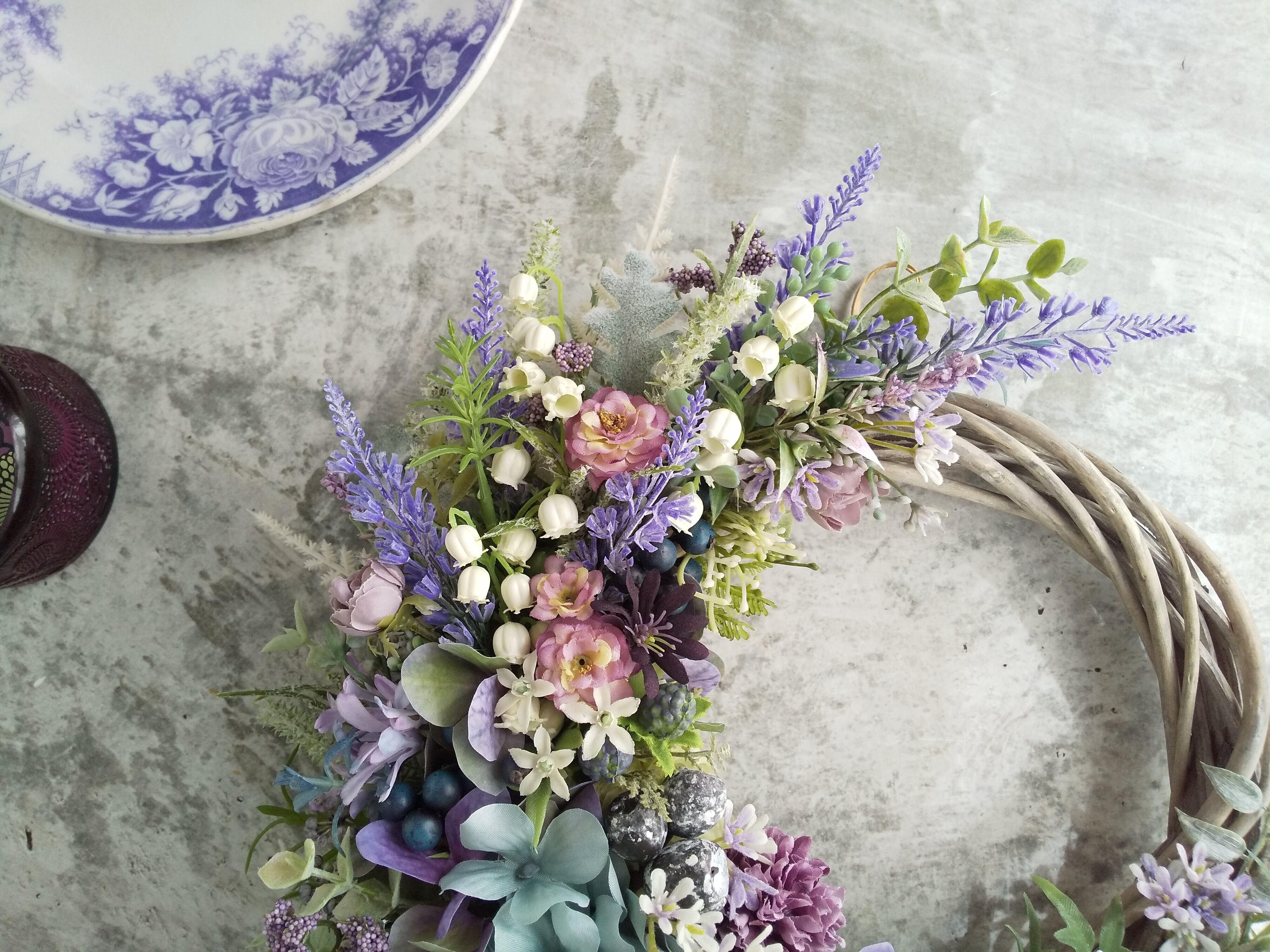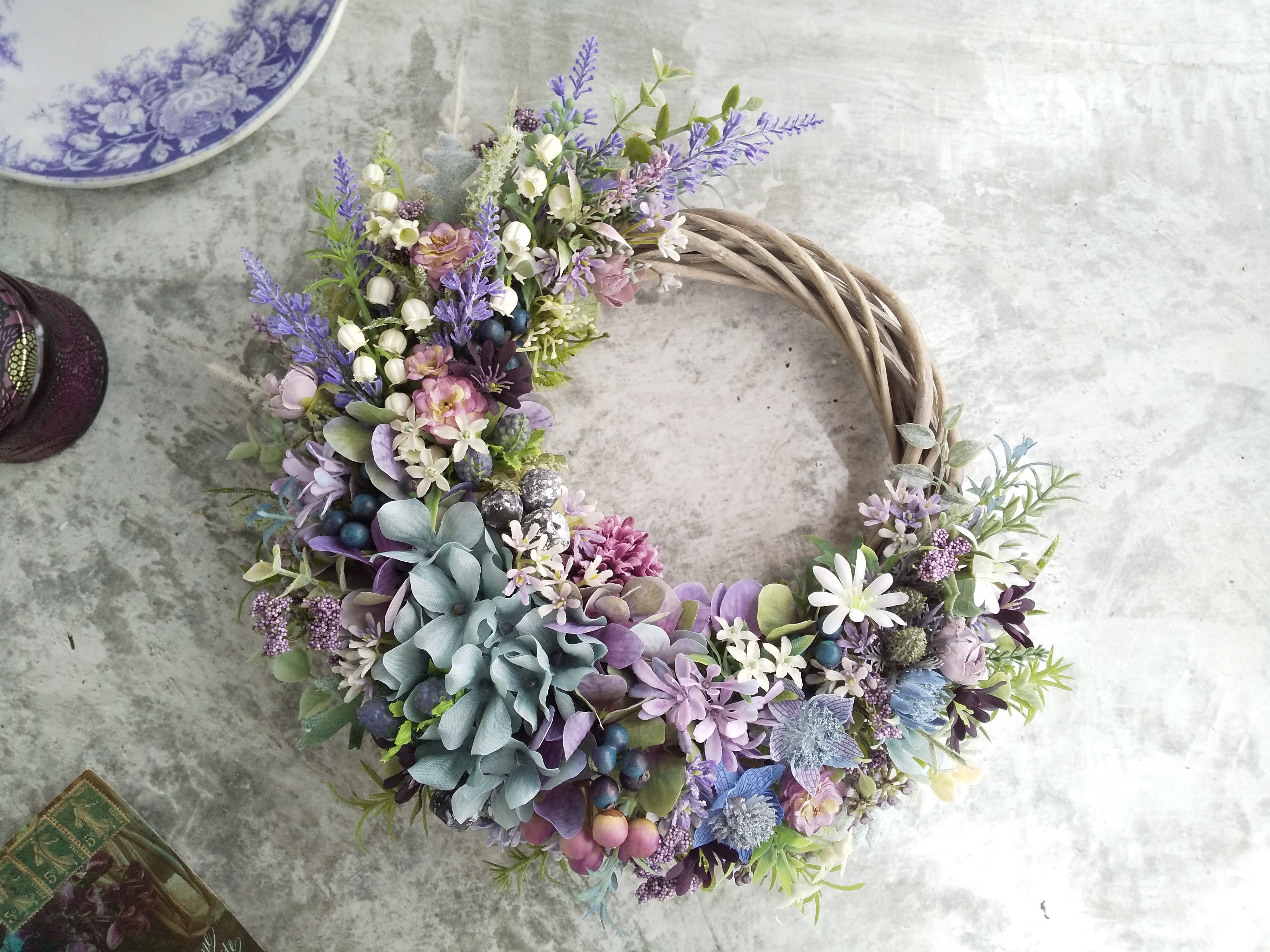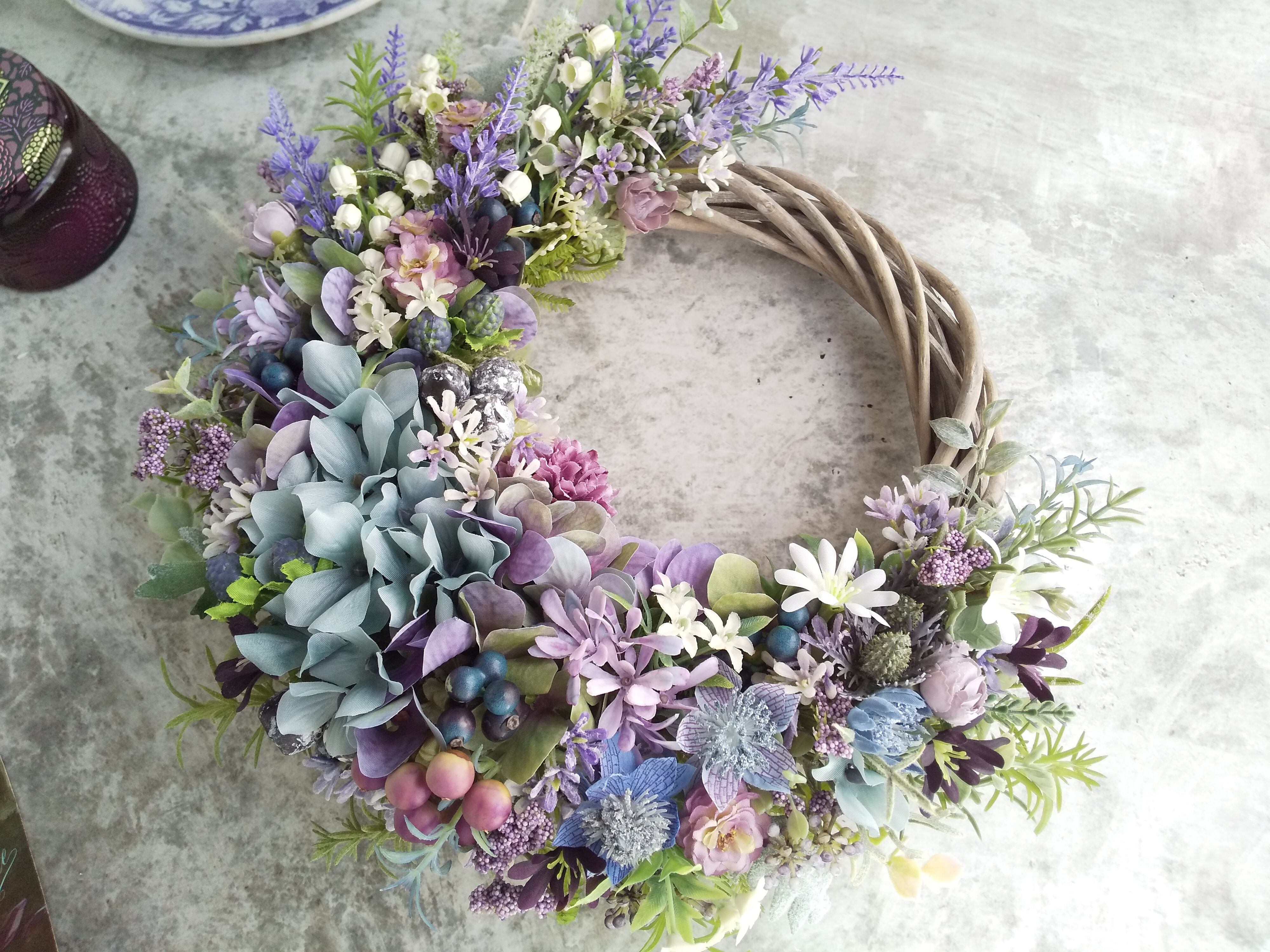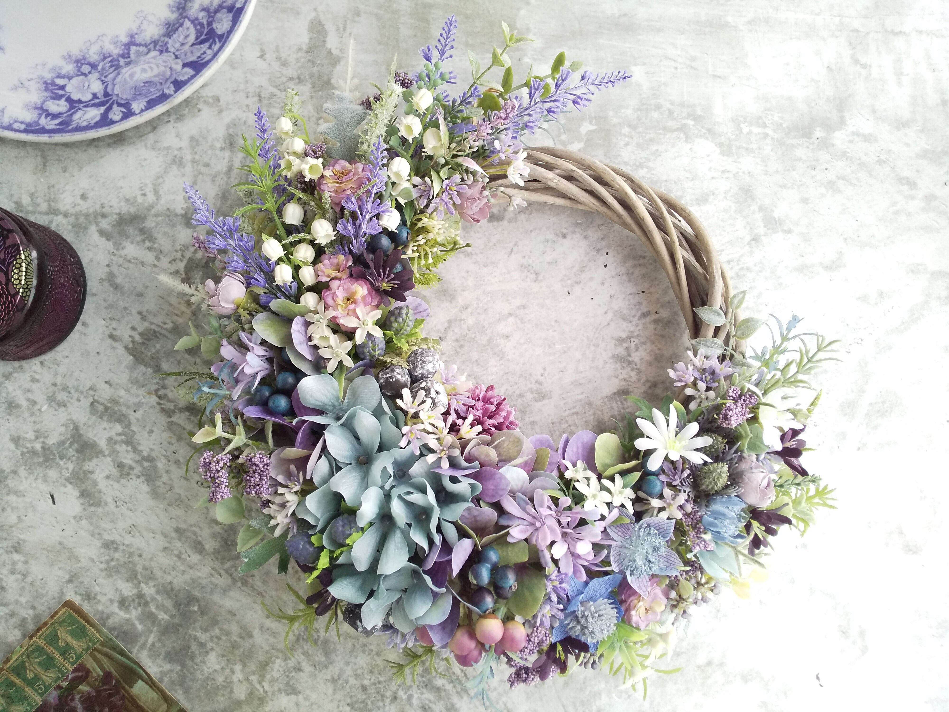 Jolie botanique<La magie de la couleur >*春リース*母の日*ハーフリース*母の日*玄関リース*シャビーシック*紫陽花*アーティフィシャルフラワー*すみれ色