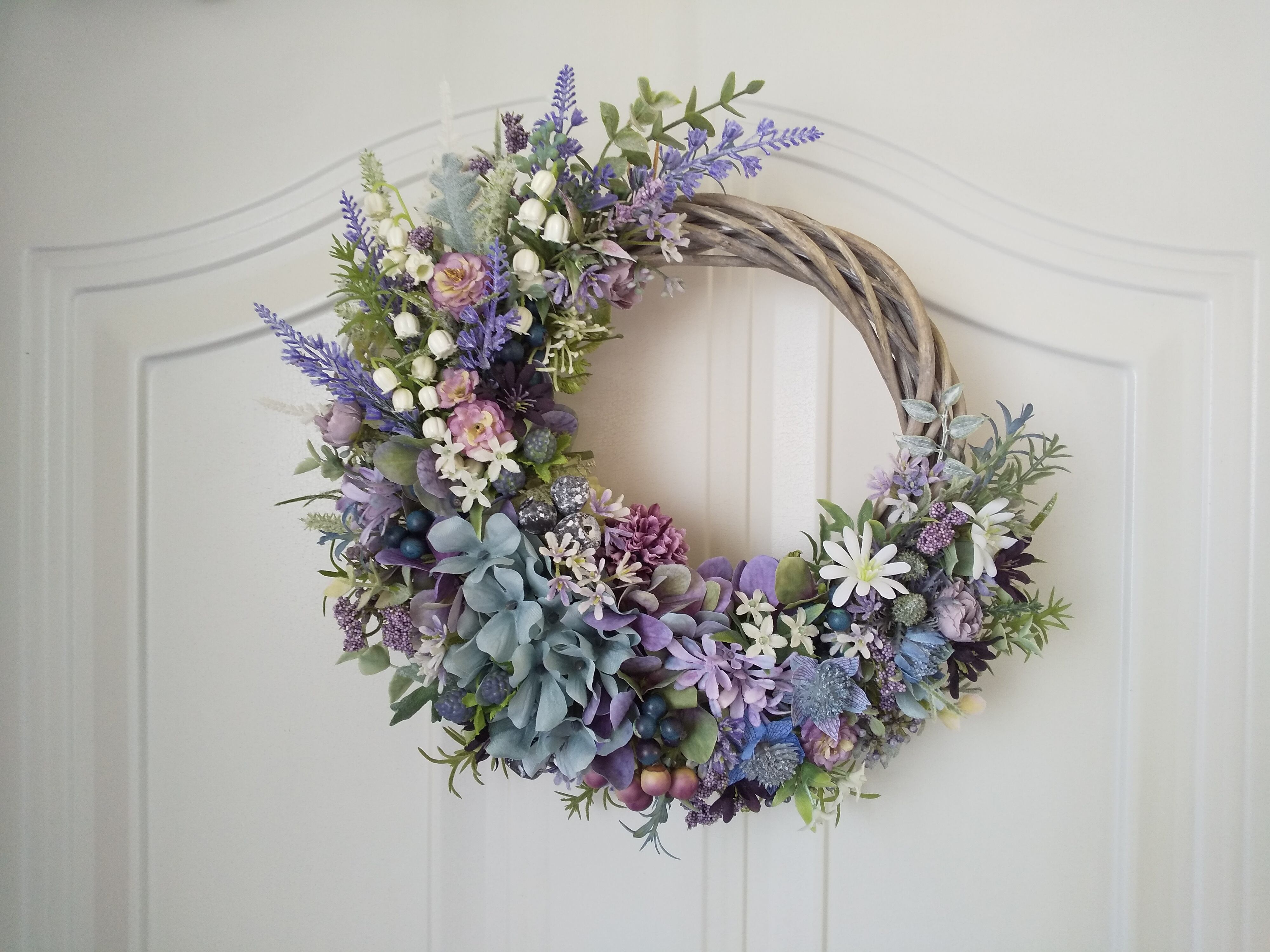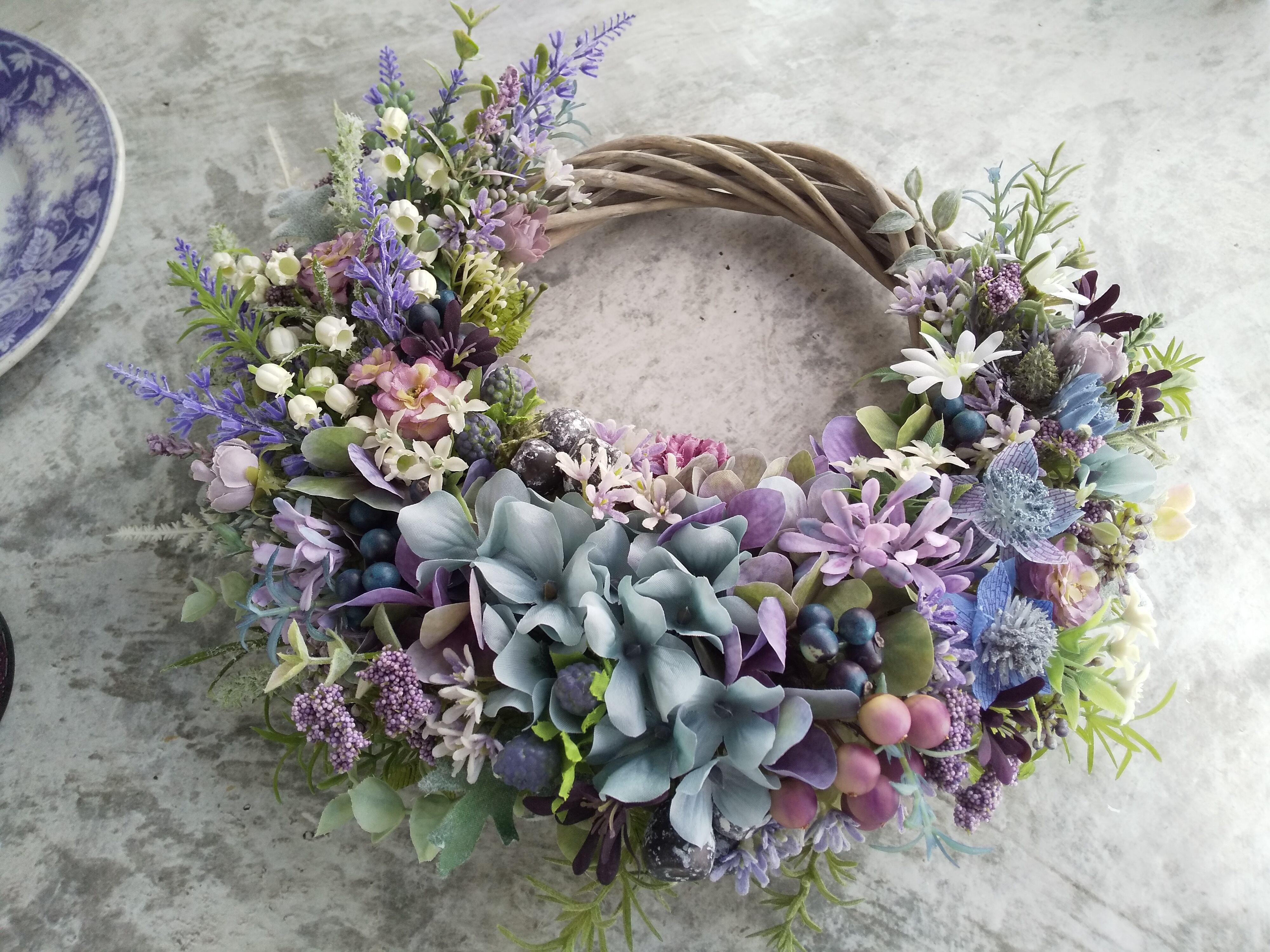 花材:<アーティフィシャルフラワー>アジサイ・アストランティア・スズラン・ポンポンローズ・デイジー・ラベンダー・マム・小花・ユーカリ・ユーカリシード・ラズベリー・エリンジウム・シロタエ・葉ものなど